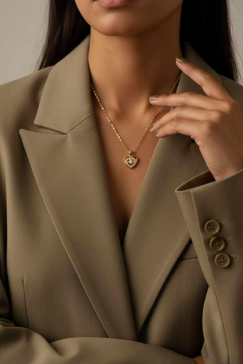 The Aubrey Necklace showcases a radiant gold heart pendant with delicate layered detailing for a timeless, romantic look. Elegant and versatile, it adds a luxurious touch to both everyday outfits and special occasions. A perfect gift choice that symbolizes love, elegance, and refined style.