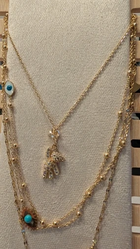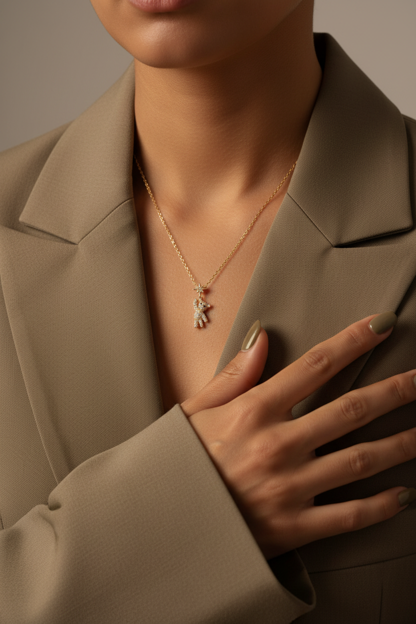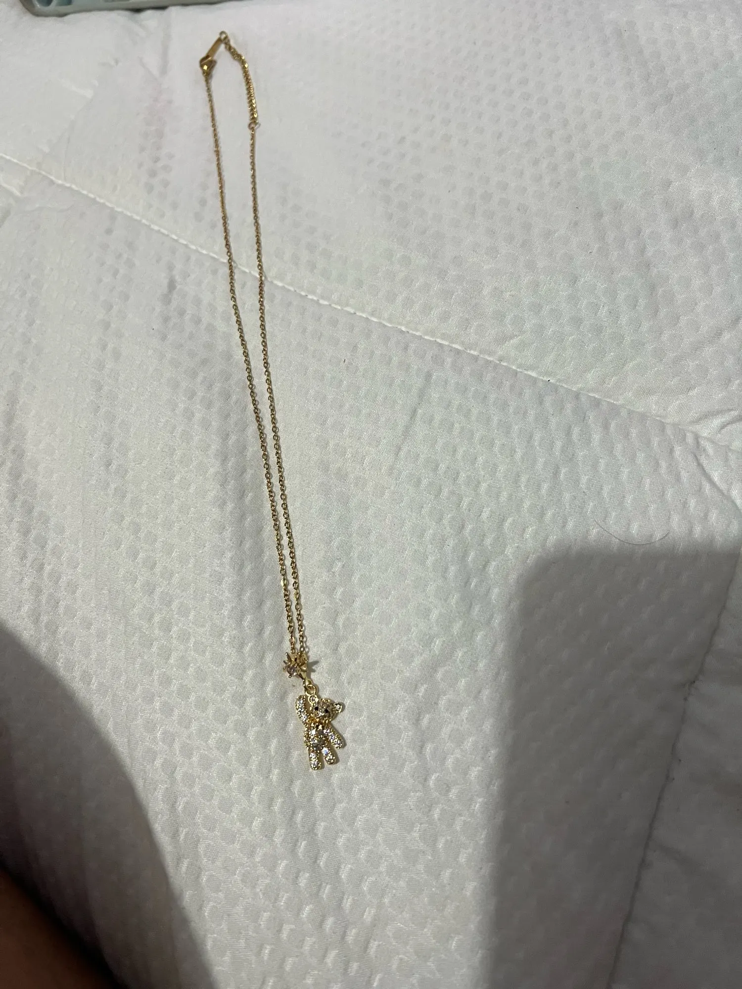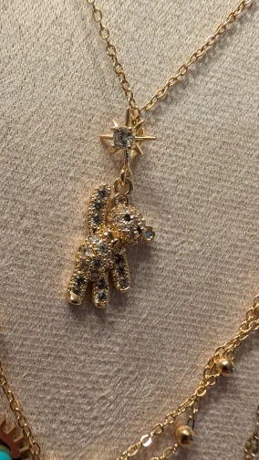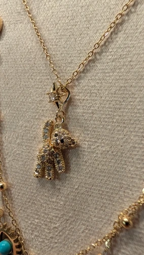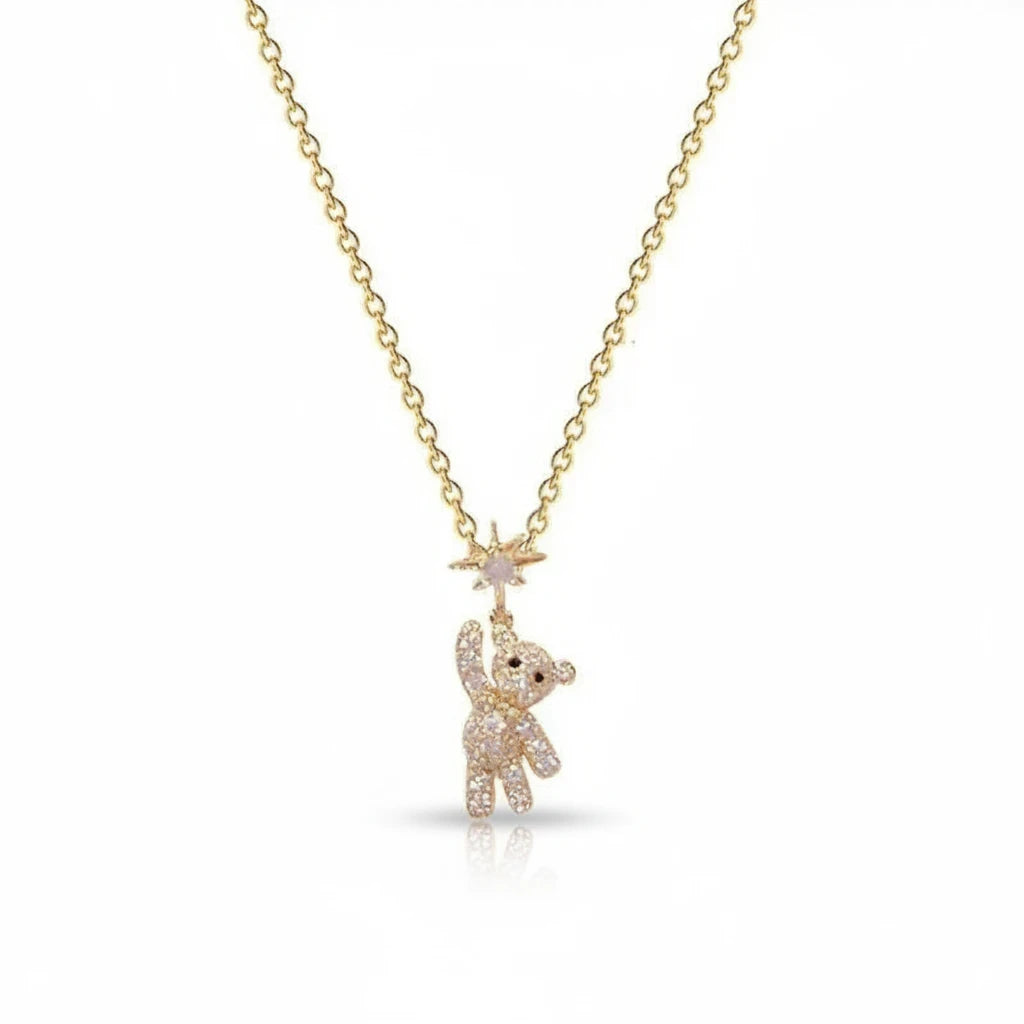 Bring a touch of playful elegance to your style with the Delphine Necklace, featuring a charming bear pendant adorned with shimmering crystals. Suspended from a delicate gold-tone chain, the pendant shines beautifully under the light, creating a sweet yet sophisticated look. Perfect for daily wear, gifting, or adding a whimsical sparkle to any outfit.