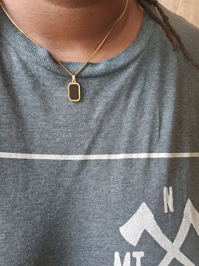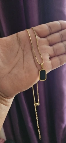 The Kaia Necklace is a sleek gold-tone necklace featuring a minimalist black rectangular pendant. Designed with a classic chain and a polished finish, this piece adds a modern and elegant touch to any outfit. Perfect for everyday wear or special occasions
