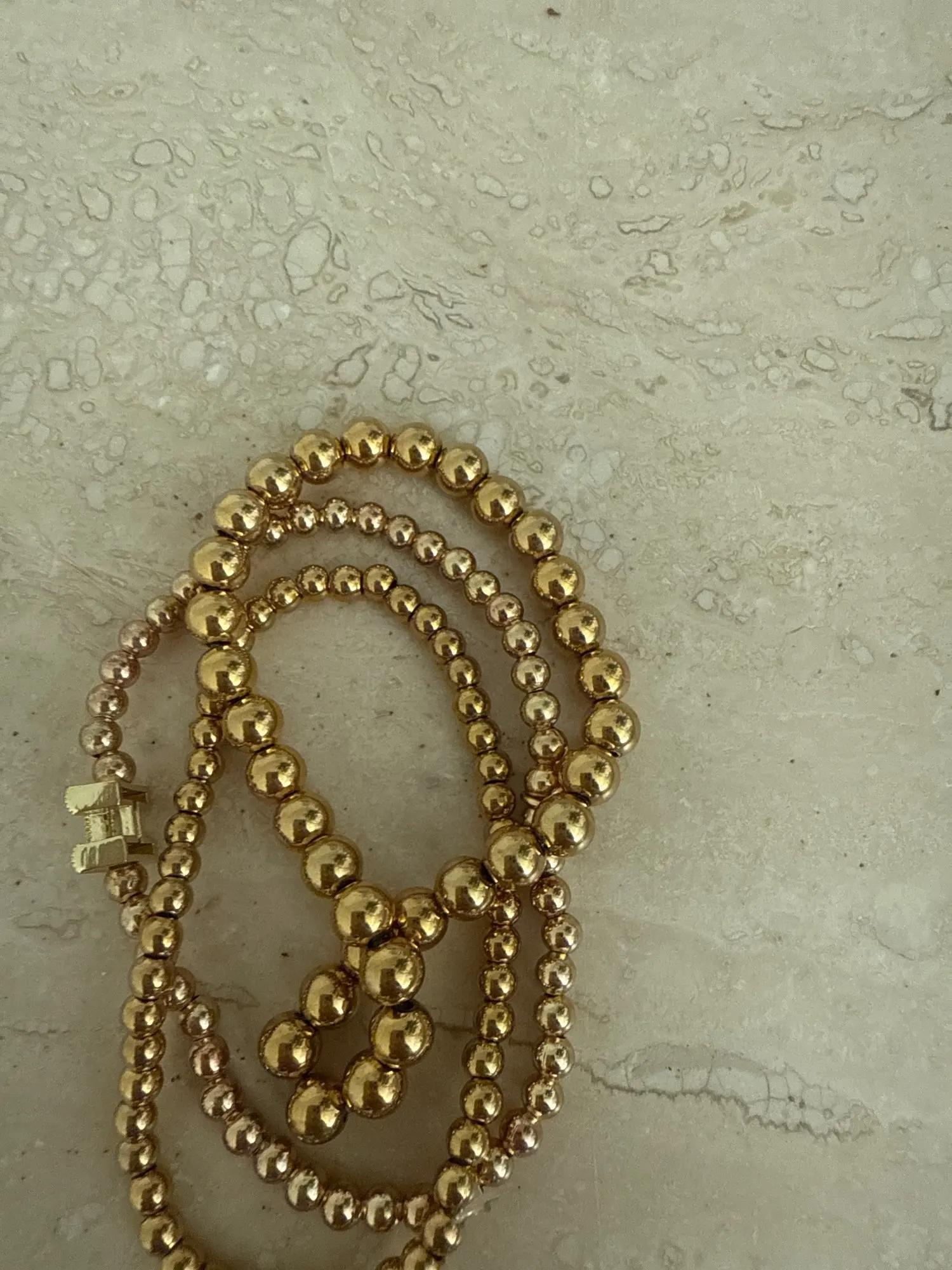 Margaret is a set of gold-toned beaded stretch bracelets, elegantly designed with graduated bead sizes. The set includes multiple bracelets, each made of smooth, polished metallic beads ranging from tiny micro-beads to bold statement-sized spheres. The variation in bead sizes allows for a layered, stacked look that's both stylish and versatile.