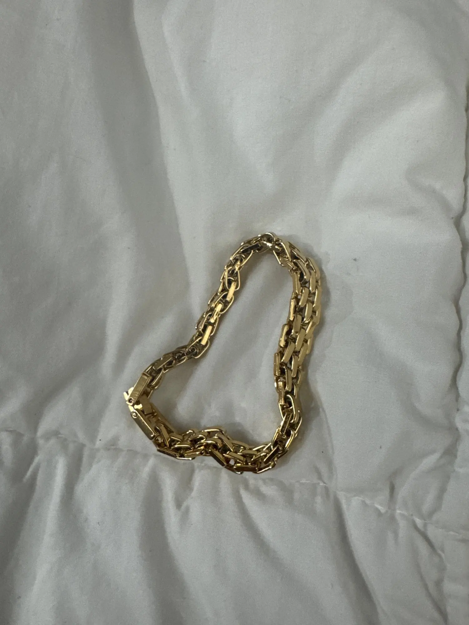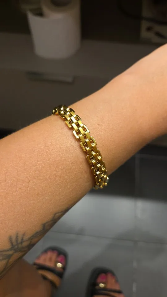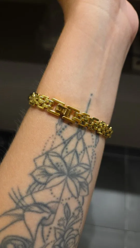 Valentina is a gold-toned link bracelet featuring a double-row chain design. The bracelet showcases interlocking rectangular links, creating a bold yet refined look. The geometric pattern adds a modern edge, while the polished gold finish enhances its luxurious appeal. It appears to have a secure clasp closure, ensuring both style and functionality.